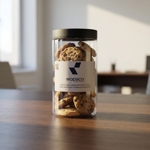 - Koekjes: Wie smult er nu niet graag eens van een koekje op het werk? Vul de pot met lekkers en verras je collega’s.